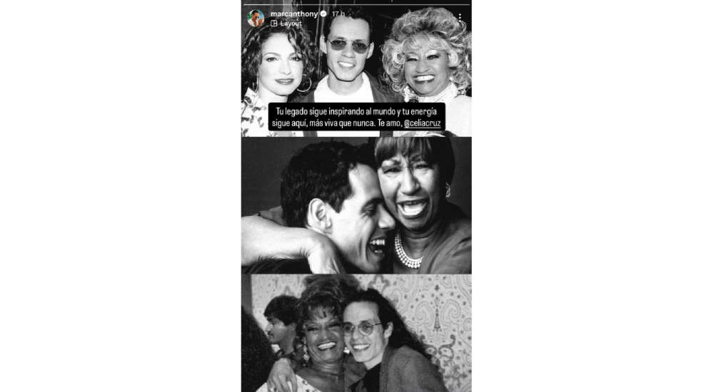 En la primera imagen destaca un joven Marc Anthony posando junto a Celia Cruz y Gloria Estefan, otra leyenda de la música caribeña. Otras fotografías del conjunto muestran a Marc y Celia sonrientes y abrazados, reflejando una relación cercana y llena de complicidad.